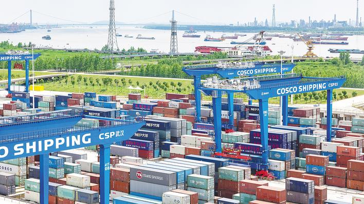 武汉中远海运港口码头有限公司的集装箱码头一片繁忙。 (湖北日报全媒记者 任勇 通讯员 赵玉 摄)